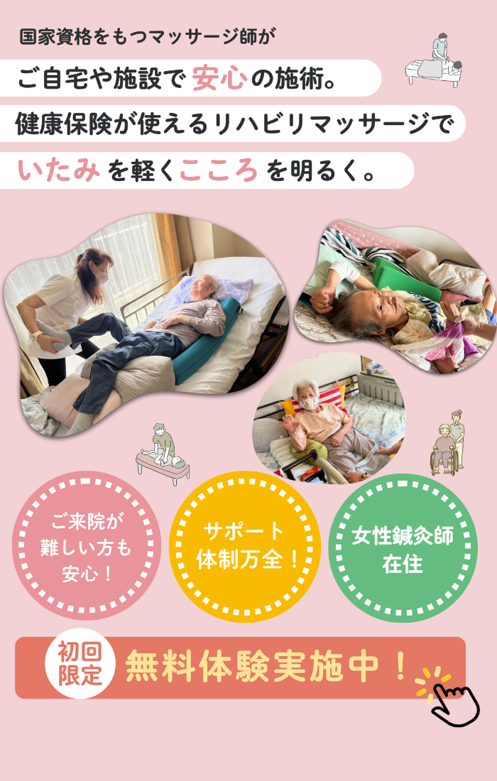 痛みや痺れがあり通院が厳しい方、老若男女問わずリハビリマッサージを必要としている方の様々なお悩みに寄り添い、ご利用者さまが安心できるご自宅で皆様の痛み・辛さを取り除きます。