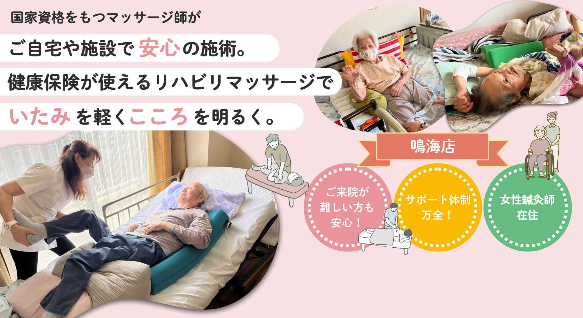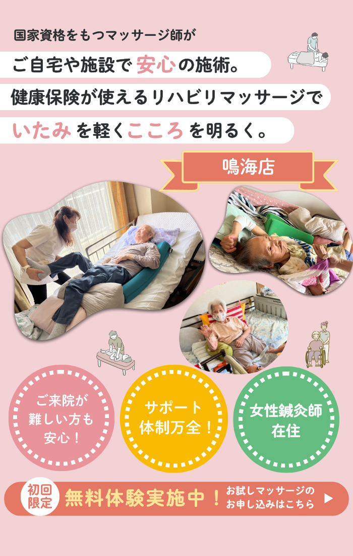 痛みや痺れがあり通院が厳しい、時間が無いのでマッサージに行く暇がないなど、老若男女問わずリハビリマッサージを必要としている方の様々なお悩みに寄り添い、ご利用者さまが安心できるご自宅で皆様の痛み・辛さを取り除きます。